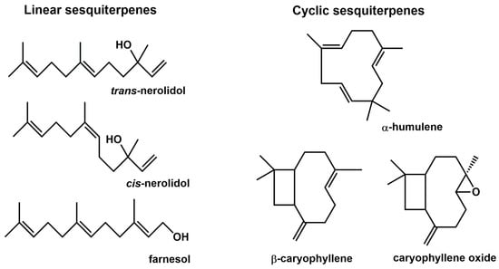 Recently, sesquiterpenes have drawn the attention of the research community owing to their considerable anti-inflammatory, antitumorigenic, antioxidant, and antiparasitic activities. Carrying these promising characteristics as the major components of plant essential oils, they are often present in various herbal medicines and nutraceuticals, especially widely used in the cosmetics and pharmaceutical industries [6]. Furthermore, as sesquiterpenes are inherent components of many spices, traditional delicacies, and beverages, they are often present in the human diet [7]. Their lipophilic character allows them to be easily absorbed following oral (or even topical) administration, with a single oral dose leading to measurable plasma concentrations [8,9,10].