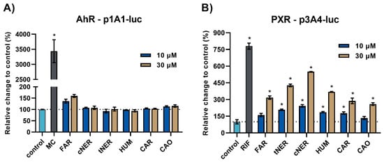 Initially, all the sesquiterpenes were tested for the ability to activate the PXR and AhR nuclear receptors, which are known to be involved in the xenobiotic-induced increase of cytochrome P450 (CYP) 3A4 and CYP1A enzyme expression, respectively [19,20,21]. A luciferase reporter gene assay in HepG2 cells was employed for this purpose. The cells were treated with the sesquiterpenes in two concentrations (10 and 30 μM). Rifampicin (RIF, 10 μM) and methylcholanthrene (MC, 10 μM), well-known PXR and AhR ligands, respectively, were used as positive controls.
