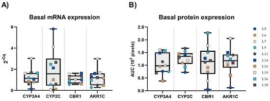 In the control PCLS, basal expressions of four selected DMEs at the mRNA and protein level were measured. Concerning mRNA expression, CYP2C was the DME with the highest variability, while CBR1 was the most stably expressed gene (Figure 3A). The mRNA levels of CYP2C and CBR1 among samples with the lowest and the highest expression differed 92.2-times and 2.9-times, respectively. With regards to protein expression, the situation was reversed and CBR1 exerted the highest variability among the studied enzymes, while CYP2C was stably expressed in all liver samples (Figure 3B).