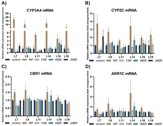 The linear sesquiterpenes FAR, cNER, and tNER showed some effects on the mRNA expression of DMEs. Results are presented in Figure 4. In patient L7, FAR and tNER caused a significant decrease in the mRNA level of all four studied enzymes. This inhibitory effect was most pronounced in the case of CYP3A4, in which FAR and tNER reduced the level of mRNA by 76.3% and 60.8%, respectively. In this patient, basal expression of CYP3A4, CYP2C, and AKR1C ranked among the highest expression levels. In patient L9, tNER induced AKR1C expression 1.4-times. Taken together, FAR significantly influenced the expression of CYP3A4 and CBR1 in one patient and the expression of CYP2C and AKR1C in two patients; cNER reduced only CBR1 expression in one patient; while tNER inhibited the mRNA level of CYP3A4, CYP2C, CBR1, and AKR1C in one patient and induced AKR1C expression in another. In contrast to the linear sesquiterpenes, the cyclic sesquiterpenes HUM, CAR, and CAO showed no significant effect on the mRNA expression of all the studied DMEs (Figure S1). The applicability of the chosen model system was proved by 10 μM RIF (positive control, a prototypical ligand of the human PXR), which caused significant induction on CYP3A4 expression in PCLS from all patients.