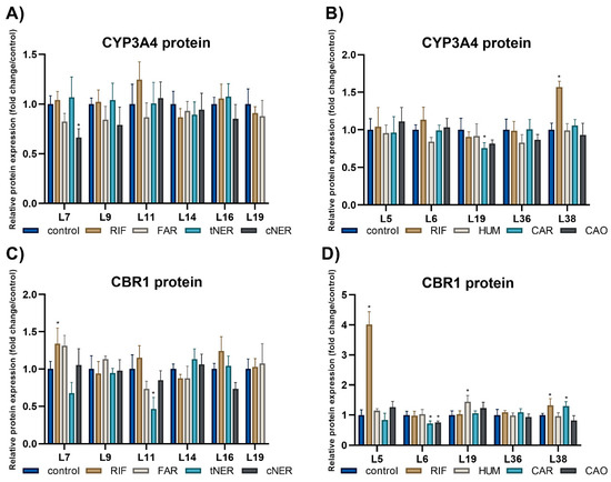 Inter-individual differences in the effect of sesquiterpenes (10 μM) and RIF (10 μM) on the normalized protein expression of CYP3A4 (A,B) and CBR1 (C,D) in human PCLS from ten patients after 24 h (n = 3). The protein expression was calculated using calnexin as a loading control. Results are presented as the mean ± SD (n = 4), with controls set to 100%. Statistical analyses were performed using one-way ANOVA with Dunnett’s test: p < 0.05 (*).