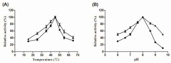Effect of temperature (A) and pH (B) on the activity of free (circles) and immobilized (triangles) Aly08. (A) Optimal temperature for the activity of free and immobilized Aly08 was determined in 50 mM sodium phosphate buffer (pH 8.0) at diverse temperatures (15–65 °C). (B) Optimal pH for the activity of free and immobilized Aly08 was determined at 45 °C. The enzymatic activity of a fresh sample of free or immobilized Aly08 measured at pH 8.0 and 45 °C was defined as 100%.