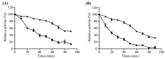 Thermo-stability of free (circles) and immobilized (triangles) Aly08 at 37 °C (A) and 45 °C (B). Residual activities were measured at 45 °C and pH 8.0. The activity of enzyme without incubation was defined as 100%.