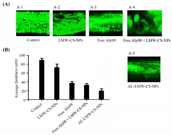 Prevention of biofilm formation in flow cell model. (A) Confocal laser scanning microscopy (CLSM) analysis of P. aeruginosa PAO1 biofilm formations in flow cell with media supplemented without (A-1) and with LMW-CS-NPs (A-2), free Aly08 (A-3), free Aly08 + LMW-CS-NPs (A-4) and AL-LMW-CS-NPs (A-5); (B) Average thickness of P. aeruginosa biofilms after indicated treatment.