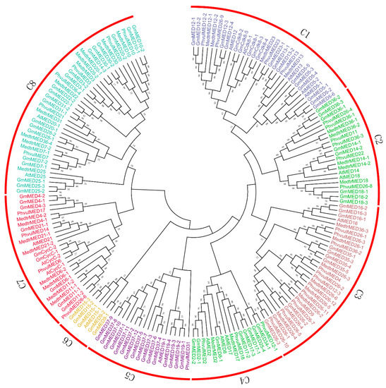 Phylogenetic tree for mediator complex subunits of soybean, Arabidopsis, Phaseolus vulgaris, and Medicago truncatula. The phylogenetic tree was constructed by MEGA 6.0 using the Neighbor-Joining method. The evolutionary distances were computed using the p-distance method. Bootstrap values in percentage (1000 replicates) are indicated on the nodes. Different subfamilies are highlighted using different colors and marked with red arcs outside of the cycle tree.