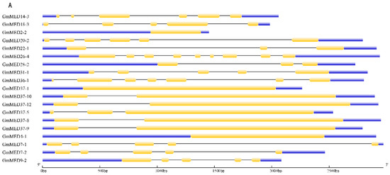 For an improved understanding of the characteristics of the soybean mediator complex subunits, the gene structure was analyzed by comparing the full-length genomic sequence with the corresponding coding sequence (Data sheet S1). Exons, introns, and upstream/downstream regions of the 95 mediator subunits were predicted using the GSDS 2.0 database [38]. The number of exons and introns per subunit ranged from 1 to 22, therefore the subunits were grouped by the length of the genomic sequence and the gene structure was analyzed (Figure 3). The gene structure of the soybean mediator subunits, including the length and the numbers of exons and introns, showed highest similarity within the same subunits with the difference in the suffix of -1, -2, -3 et al., and within a group the subunits differed in the length of the introns and the upstream/downstream regions.
