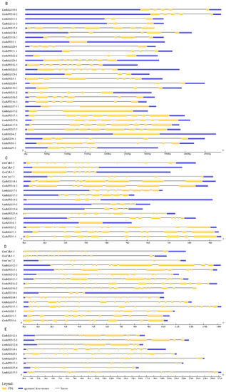 Gene structure of soybean mediator complex subunits. The structures of the 95 soybean mediator subunits were plotted using yellow boxes representing CDS (coding DNA sequence, exons), black lines representing introns and blue boxes indicating upstream/downstream sequences. The genes are listed by the length of the genomic sequence, from A to E represents sequence difference in size. A: <3 kb; B: 3 kb–5 kb; C: 5 kb–10 kb; D: 10 kb–15 kb; E: >15 kb The scale representing the length of each gene is on the bottom.