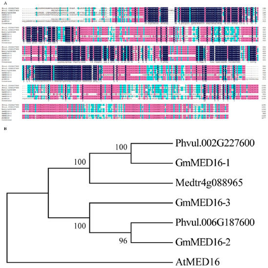 It was previously reported that MED16 plays a crucial role in the defense response in Arabidopsis [35,36]. Three MED16 homologs were detected in soybean, namely GmMED16-1, GmMED16-2, and GmMED16-3. On the basis of the sequence similarity of the MED16 protein, two MED16 proteins were identified in P. vulgaris and one in M. truncatula. Together with AtMED16, in total seven MED16 proteins were used for sequence alignment and phylogenetic analysis (Figure 4). Sequence alignment revealed that, with the exception of GmMED16-3, the remaining six proteins showed high sequence similarity (Figure 4A). Phylogenetic analysis revealed that the sequence of MED16 proteins was highly conserved among legume species (Figure 4B).