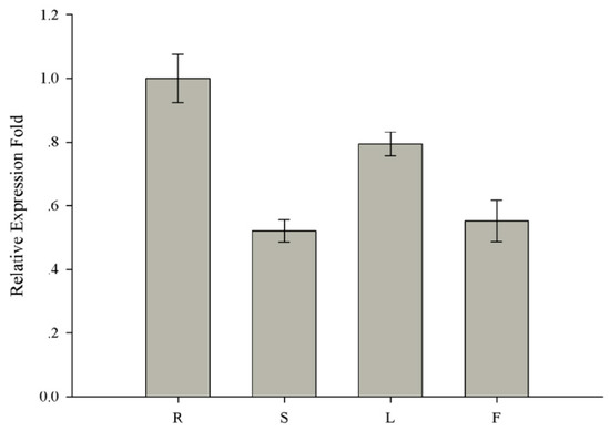 Expression profiles of GmMED16-1 in various soybean tissues. Expression of GmMED16-1 was detected in various soybean tissues under field grown conditions. Samples were collected in the flowering stages. The expression levels are normalized to GmCons4 gene as an endogenous control. R: roots, S: stems, L: leaves, F: flowers.