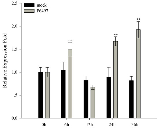 Expression profiles of GmMED16-1 under Phytophthora sojae inoculation. Leaves from the seven days old seedlings were used for P. sojae infection. The mock control was treated with the V8 medium without P. sojae. Samples were collected from the inoculated area as well as the mock control at 0, 6, 12, 24, and 36 h post-infection (hpi). The expression levels are normalized to GmCons4 gene as an endogenous control. ** indicate significant difference from control at p < 0.01, respectively.