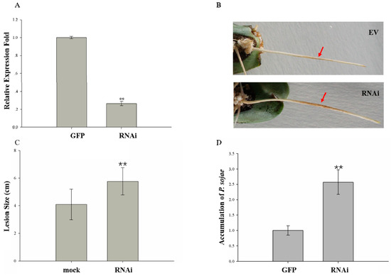 Given that GmMED16-1 expression was highest in the root (Figure 5), we investigated whether GmMED16-1 was involved in soybean–P. sojae interaction using Agrobacterium rhizogenes mediated hairy root transformation using RNA interference (RNAi) in soybean cotyledons. A 365 bp conserved DNA fragment was selected to specifically silence GmMED16-1. The pHellsGate12:GFP:GmMED16-1 RNAi vector was constructed using the Gateway technology and the plasmid was transformed into Agrobacterium rhizogenes strain K599 by electroporation. Hairy roots that exhibited GFP fluorescence were first used to detect the RNAi efficiency. The results of qRT-PCR analysis indicated that the RNAi efficiency attained 70%, thus the expression level of the transgene in the RNAi hairy root was only 30% that of the mock roots (Figure 7A).
