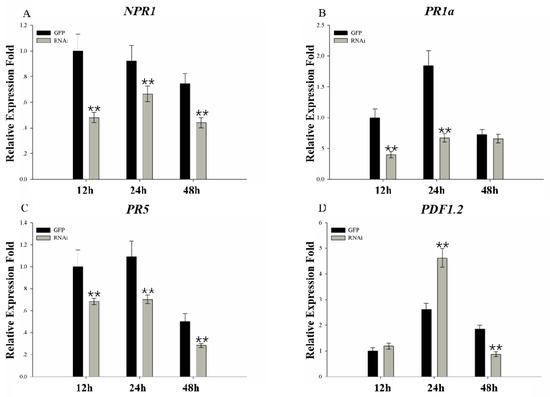 Expression profiles of NPR1, PR1a, PR5 and PDF1.2 in the transgenic hairy roots. Expression of marker genes NPR1, PR1a and PR5 in the SA signaling pathway and PDF1.2 in the JA pathway was detected in the RNAi hairy roots as well as the mock ones. The hairy roots were inoculated with zoospore suspension (about 104 zoospores/mL) of P. sojae P6497. Samples were collected at 12, 24 and 48 hpi. The expression levels are normalized to GmCons4 gene as an endogenous control. ** indicate significant difference from control at p < 0.01, respectively.