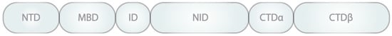 Schematic representation of the functional domains of methyl CpG binding protein 2 (MeCP2). MeCP2 contains an N-terminal domain (NTD), a methyl-binding domain (MBD), an intervening domain (ID), an NCoR-interacting domain (NID), and C-terminal domains α and β (CTDα and CTDβ, respectively).