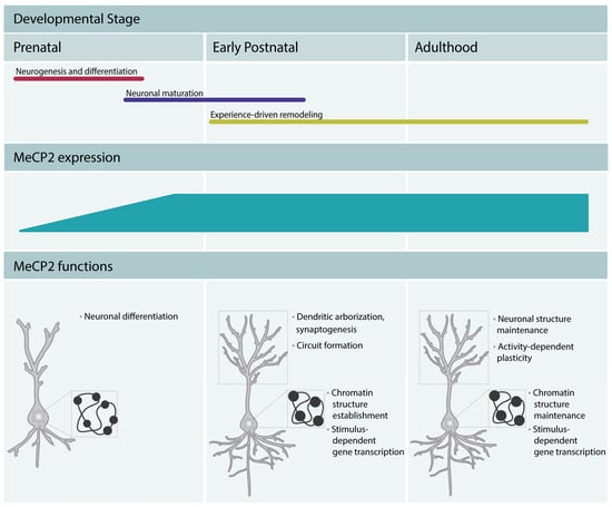 Studies of MeCP2 expression pattern showed that it was present at higher levels in lung, spleen, and brain, with the highest levels in the latter. In mice, the levels of protein are low in the early stages of embryonic development [,], increase during the later developmental phases, and reach higher levels in mature neurons []. The levels of MeCP2 remain high throughout adulthood, which underscores its important function in the mature brain. In humans, MeCP2 expression starts in mid gestation and continues increasing until 10 years of age []. The increase in MeCP2 expression occurs after the neurogenesis and differentiation are completed and coincides with the stages of neuronal maturation, such as dendritic growth and branching and dendritic spine morphogenesis [,]. These early studies suggested a role for MeCP2 in the late stages of neurodevelopment and a function in mature neurons and implicated MeCP2 function as dispensable during early embryonic stages. The delayed expression pattern of MeCP2 was believed to underlie the apparently normal early development of RTT patients. The analysis of MeCP2 mouse knockouts [,] and mice with a truncating mutation in the Mecp2 gene [] further supported this view. The mutant mice appeared normal until 5 to 6 weeks after birth, after which phenotypes associated with neuronal dysfunction started to appear. However, more recent work demonstrated that MeCP2 expression can be detected in immature neurons of the prenatal cortex in mouse [] and human induced pluripotent stem cell (iPSC)-derived neuronal progenitor cells (NPCs) []. Moreover, clinical studies revealed neurological alterations in RTT patients within the first months of life. Careful analysis of RTT patients showed altered general movements [,] and atypical speech-language capacities []. Hence, the expression of MeCP2 from the early stages of development through adulthood in both mice and humans and the presence of neurological deficits in RTT patients from early life suggest now that MeCP2 regulates all stages of neurodevelopment and adult brain function (Figure 2).