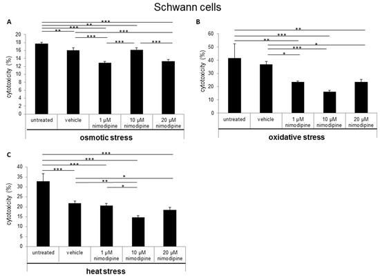 The cytotoxicity was measured via lactate dehydrogenase (LDH) activity in cell culture supernatants after the treatment of cells with 150 mM NaCl (osmotic stress), 2% EtOH (oxidative stress) and incubation for 6 h at 42 °C (heat stress). The Schwann cells showed a nimodipine-dependent significant reduction of cytotoxicity up to 19% at osmotic stress (1 µM and 20 µM nimodipine, p ≤ 0.001; Figure 1A). Under oxidative stress, the cytotoxicity was reduced via the treatment of 1 µM, 10 µM and 20 µM nimodipine from 36% to 23%, 16% and 23% (p ≤ 0.001, Figure 1B), respectively. The analysis of the nimodipine-treated Schwann cells after heat stress demonstrated a reduction from 21% to 14% (10 µM nimodipine, p ≤ 0.01; Figure 1C) and 18% (20 µM nimodipine, p ≤ 0.01) in comparison to the vehicle cells. The treatment with 1 µM nimodipine showed no significant alteration of the Schwann cell cytotoxicity under heat stress.