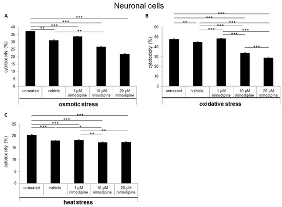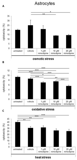 During osmotic stress, the cytotoxicity of astrocytes was reduced from 25% to 13% (Figure 3A; 10 µM nimodipine p ≤ 0.01) and 14% (20 µM nimodipine p ≤ 0.05). After the incubation of the cells with 2% ethanol (oxidative stress), the results showed a decreased cell death of up to 25% (Figure 3B; 20 µM nimodipine p ≤ 0.001). Under heat stress, a reduction of the cytotoxicity of up to 17% (Figure 3C; not significant compared to the vehicle) was detected. The treatment with 1 µM nimodipine showed no significant reduction of the astrocyte cytotoxicity.
