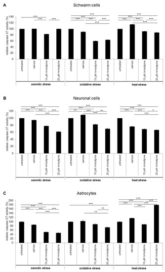 The influence of the nimodipine treatment on the caspase 3 and 7 activity of stressed cells was detected via Caspase-Glo 3/7 Assay (Promega). The analysis showed an alteration of caspase 3 and 7 activity through the nimodipine treatment under osmotic, oxidative and heat stress in Schwann cells (Figure 4A), neuronal cells (Figure 4B) and astrocytes (Figure 4C). Caspase 3 and 7 activity was statistically, significantly and nimodipine-dependently decreased to 83% during osmotic stress (10 µM nimodipine p ≤ 0.001), to approximately 60% during oxidative stress (10 µM and 20 µM nimodipine p ≤ 0.001) and to approximately 90% during heat stress (10 µM and 20 µM nimodipine p ≤ 0.001) for the Schwann cells compared to the vehicle cells. The neuronal cells showed a caspase activity reduction by 36% during osmotic stress (10 µM and 20 µM nimodipine p ≤ 0.001), to 82% and 70% during oxidative stress (10 µM and 20 µM nimodipine p ≤ 0.001) as well as to approximately 90% (p ≤ 0.001) during heat stress compared to the vehicle control. For the astrocytes, the caspase 3/7 activity was reduced to ~60% during osmotic (10 µM and 20 µM nimodipine p ≤ 0.001), to 71% during oxidative (20 µM nimodipine p ≤ 0.01) and to 75% during heat stress (10 µM nimodipine p ≤ 0.001) in comparison to the vehicle. The 20 µM nimodipine treatment led to an increased caspase 3/7 activity under heat stress in the astrocyte cell line (150%, p ≤ 0.001).