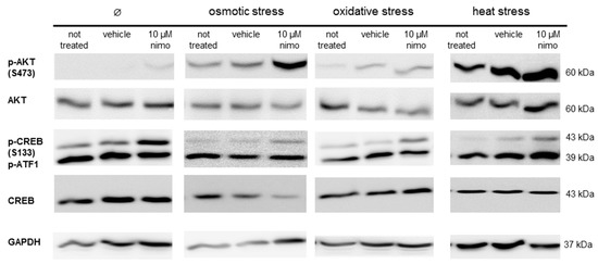 The immunoblot analysis of Schwann cells under different stress conditions. Schwann cells (SW10) were treated with 10 μM nimodipine (Nimo) or an equivalent volume of solvent (vehicle) and stressed (osmotic, oxidative or heat stress) or not stressed (∅) after 24 h. 50 μg of protein per sample was separated by SDS-PAGE and transferred onto a nitrocellulose membrane. The levels of AKT and CREB phosphorylation and the total protein amounts were detected with specific antibodies. The loading control served for the immunostaining of GAPDH. The figure shows a representative Western blot of three biological replicates.