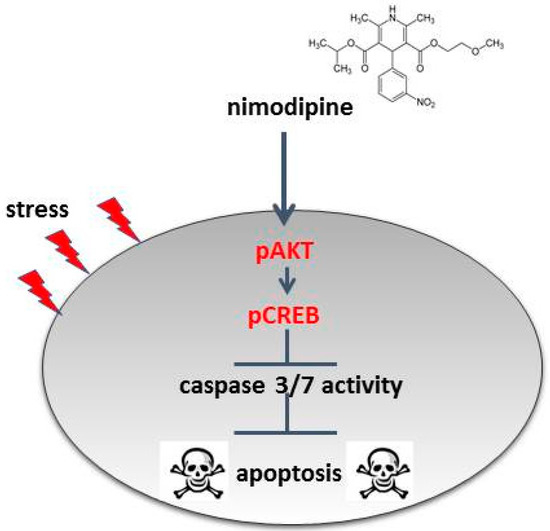 Model of the nimodipine neuroprotective mode of action. The nimodipine treatment leads to the activation of AKT and CREB signaling. AKT and CREB phosphorylation inhibits the activation of caspases and thereby the initiation of cell apoptosis.