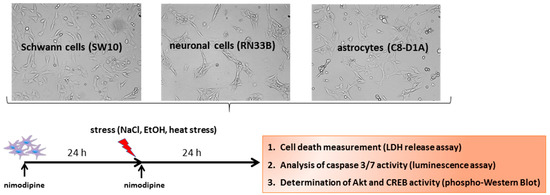 Scheme of the experimental procedure. To identify the neuroprotective molecular mechanisms of nimodipine, cell lines were pre-treated for 24 h with different concentrations of nimodipine. Then, the cells were incubated with 450 mM NaCl (osmotic stress), 2% EtOH (oxidative stress) or 6 h at 42 ° C (heat stress) and treated again with nimodipine for another 24 h. After that, cell death was measured via an LDH release assay, the caspase activation was analyzed via a Caspase 3/7-Glo assay and the cell signaling pathways were examined via Western blot.
