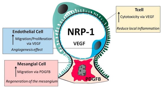 - Bartlett, C.S.; Scott, R.P.; Carota, I.A.; Wnuk, M.L.; Kanwar, Y.S.; Miner, J.H.; Quaggin, S.E. Glomerular mesangial cell recruitment and function require the co-receptor neuropilin-1. Am. J. Physiol. Ren. Physiol. 2017, 313, F1232–F1242. [Google Scholar] [CrossRef]