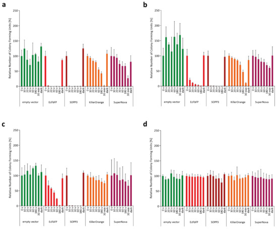 To compare the applicability of SOPP3, SuperNova, and KillerOrange for aPDI, we initially analyzed their intracellular phototoxicity. To this end, we determined the viability of PS-producing E. coli cells after illumination with blue light (LED with λmax = 448 nm for SOPP3 and KillerOrange) or orange light (λmax = 600 nm for SuperNova) by counting the colony forming units (CFU). The phototoxic effects of the endogenous PSs towards E. coli cells were measured in dependence on different light intensities (130–1 mW cm−2) as well as illumination times (0–30 min). As a reference, we additionally analyzed E. coli cells expressing EcFbFP, a LOV-based PS that was shown to perform moderate type-I and -II-mediated ROS formation resulting in an intermediate phototoxicity [47]. As shown in Figure 1, the increase of light intensity or illumination time resulted in a clear decrease of the number of viable bacterial cells for all of the tested LOV- and GFP-PSs, although the phototoxic efficacy differs strongly between the variants.
