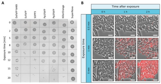 To study the applicability of genetically encoded photosensitizers as light-activated antimicrobial agents, the phototoxicity of exogenous GFP-related and LOV-based PSs was further analyzed. In addition to SOPP3, SuperNova, and KillerOrange, different LOV-based PSs were used in this study exhibiting divergent ratios of type-I and -II photosensitizing activities and, hence, intracellular phototoxicities: besides EcFbFP and DsFbFP M49I, two LOV variants showing both type-I and type-II photosensitizing activities accompanied by comparatively high intracellular phototoxicities, Pp1FbFP and Pp2FbFP were chosen as PS derivatives with a moderate antimicrobial efficacy but selective singlet oxygen formation [47]. The extracellular killing efficiency of purified photosensitizing proteins has first been investigated in a plate spot assay using E. coli cells as a proof of concept. As shown in Figure 3a, exogenous addition of all tested PSs, except SuperNova, clearly affected the cell viability of E. coli cells after high intensity light irradiation (130 mW cm−2). However, in contrast to intracellularly located PSs, the exogenous approach required a longer exposure time of 8 (EcFbFP) to 15 min (Pp1-, Pp2FbFP, KillerOrange). In a control experiment, where E. coli cells were illuminated with possibly toxic blue light without adding purified PSs, no changes in growth behavior could be observed (Supplementary Figure S3a).