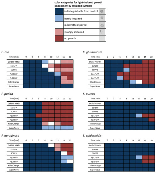 Next, we tested the extracellular PS against the facultative pathogenic Gram-positive bacteria Staphylococcus epidermidis and Staphylococcus aureus [49,50] as well as Corynebacterium glutamicum, which is related to clinically concerning Corynebacterium diphtheria and Mycobacterium tuberculosis [51,52]. In addition, the Gram-negative non-pathogenic bacterium Pseudomonas putida and the opportunistic human pathogen Pseudomonas aeruginosa, whose carbapenem-resistant strains where grouped by the World Health Organization (WHO) into the “Priority 1: CRITICAL” class of pathogens [53], were included in the phototoxicity assay. All results of the plate spot assays are shown in Supplementary Figure S3b–f. Based on this data set and experimental setup, the phototoxic effect depended on the used photosensitizer, as well as the tested microorganisms, and light-induces growth impairment could roughly be classified into five categories as summarized in Figure 4. For example, P. putida is rather sensitive to extracellularly added photosensitizers, as illumination resulted in a pronounced growth impairment irrespective of the tested PS variants. Similar results were observed with C. glutamicum and E. coli where only SuperNova did not show a phototoxic effect. Remarkably, the pathogenic species exhibited an increased tolerance towards photodynamic inactivation. For instance, cell growth of P. aeruginosa was only significantly affected by DsFbFP M49I, EcFbFP, and SOPP3 (Figure 4 and Supplementary Figure S3f). In contrast, the Gram-positive pathogens S. epidermidis and S. aureus could only be killed by the variants Pp1- and Pp2FbFP that are known to be less-toxic while exclusively forming 1O2 via type-II reaction (Figure 4 and Supplementary Figure S3b,c [47]). This observation is in good agreement with previous reports describing that Gram-negative bacteria are more susceptible to O2•−, H2O2, and HO• whereas Gram-positive bacteria show higher sensitivities towards 1O2 [54,55]. These differences might be explained by the divergent morphology: while Gram-negative bacteria possess an outer membrane that acts as an additional permeability barrier for extracellularly generated singlet oxygen, Gram-positive bacteria allow a direct translocation of the PS through the more permeable cell wall thereby facilitating a direct accessibility of the cytoplasmic membrane to this highly toxic ROS [56,57].