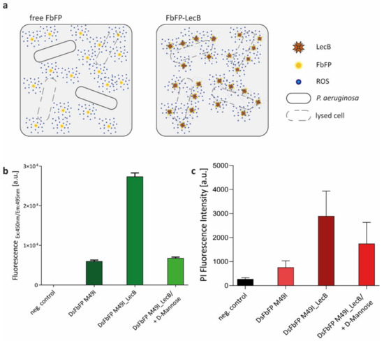 Our data illustrated, as expected, that the localization of the applied PSs in either the intra- or extracellular space of bacterial cells plays an important role for the phototoxicity. Presumably, this is caused by variations of the PS concentration within the respective compartment, which, in turn, can directly influence the frequency of interactions between ROS and the ROS-sensitive cellular structures. To evaluate, if the extracellular phototoxicity of a protein-encased PS can be enhanced by specifically directing it to the bacterial cell envelope, we fused DsFbFP M49I, which exhibits the highest extracellular phototoxicity for the human pathogen P. aeruginosa, to the lectin LecB (Figure 5a). LecB is a multivalent sugar-binding protein derived from P. aeruginosa that is naturally formed by the bacterium for biofilm formation and initiation of human infections [58,59,60]. This lectin can bind to various sugar moieties located on the surface of P. aeruginosa cells [61,62] and it was recently published that LecB immobilized on the surface of hydrogels can be used to efficiently capture P. aeruginosa cells for their treatment with antimicrobial peptides [63]. Based on these findings, we analyzed if LecB can be used to facilitate the extracellular attachment of C-terminally fused DsFbFP M49I to P. aeruginosa for their efficient photodynamic inactivation. To analyze, if extracellular DsFbFP M49I-LecB shows improved cellular binding and phototoxicity, PS and PI fluorescence signals of washed cells were monitored in comparison to free DsFbFP M49I in the absence and presence of LecB-inhibiting d-mannose. The results shown in Figure 5b indicate that fusion with LecB enables DsFbFP M49I to bind over four times more efficiently to P. aeruginosa cells in the absence of d-mannose. More importantly, the extracellular antimicrobial phototoxicity of DsFbFP M49I-LecB increased 3.8-fold in comparison to the unmodified PS (Figure 5c). Consequently, the DsFbFP M49I-LecB fusion protein allowed an improved targeting and photodynamic inactivation of P. aeruginosa, presumably because more of the PS proteins are positioned close to the cell surface and ROS thus have to overcome shorter distances in order to damage cellular components.