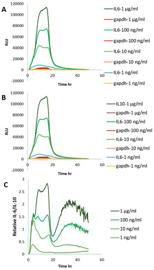 To find appropriate concentration of LPS, stable cells were plated in 24-well black plate with clear bottom for 24 h. Cells were replaced with DMEM with 10% FBS, 0.1 mM D-Luciferin potassium salt, 25 mM hepes, and LPS at 1 ng/mL, 10 ng/mL, 100 ng/mL, and 1 μg/mL. Bioluminescence was recorded in real-time with multi-color system under a 5% CO2 atmosphere at 37 °C for 48 h. In Figure 1, it appears that LPS response to IL6 and IL10 levels in stable cells are concentration-dependent. LPS also response to relative IL-6/IL-10 are concentration-dependent (Figure 1C).