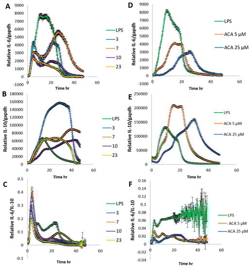 The expression of relative IL-6/gapdh and IL-10/gapdh by real-time bioluminescence recording for 48 h. (A) Stable IL-6/gapdh RAW264.7 cells and (B) stable IL-10/gapdh RAW264.7 cells were treated with crude ethanol extracts from nutmeg (3), oregano (7), laurel (10), and long pepper (23) at 75 μg/mL and LPS at 100 ng/mL. (D) Stable IL-6/gapdh RAW264.7 cells and (E) Stable IL-10/gapdh RAW264.7 cells were treated with 1′S-1′-Acetoxychavicol acetate (ACA) at 5, 25 and 100 μM from greater galangal and LPS at 100 ng/mL. (C,F) Relative IL-6/IL-10. Each value represents the mean ± SD (n = 4).