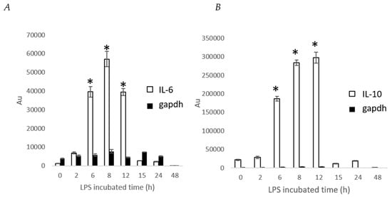 Expression of IL-6 and IL-10 in LPS treated stable cell using a microplate luminometer. Stimulation of stable cells with LPS 100 ng/mL for various time periods. (A): IL-6 and gapdh luciferase reporter activity. (B): IL-10 and gapdh luciferase reporter activity. Each value represents the mean ± SD (n = 4). * p < 0.001 versus the LPS group.