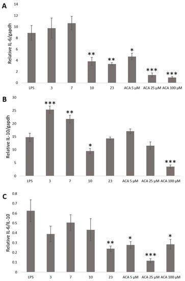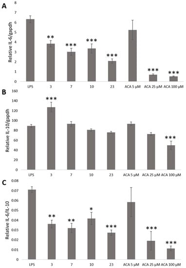 The expression of relative IL-6/gapdh (A), IL-10/gapdh (B) and IL-6/IL-10 (C) by microplate luminometer at 8 h. Stable cells were treated with crude ethanol extracts from nutmeg (3), oregano (7), laurel (10), and long pepper (23) at 75 μg/mL and 1′S-1′-Acetoxychavicol acetate (ACA) at 5, 25, 100 μM from greater galangal and LPS at 100 ng/mL. Each value represents the mean ± SD (n = 4). * p < 0.05, ** p < 0.01, *** p < 0.001 versus the LPS group.