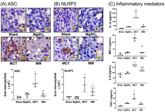 Magnesium sulfate (MgSO4) mitigates monocrotaline-induced upregulation of inflammasomes and inflammatory mediators in the lung tissues. Representative microscopic images of (A) apoptosis-associated speck-like protein containing a caspase recruitment domain (ASC, an adaptor protein for inflammasome receptors) and (B) nod-like receptor protein 3 (NLRP3, the crucial element of inflammasomes) in the lung tissues through immunohistochemistry staining assay (200×) are displayed. Quantitative sum intensities of ASC and NLRP3 are presented. Red arrows in (A) and (B) indicate the representative images of ASC and NLRP3 with brown color staining, respectively. (C) Pulmonary levels of interleukin-1β (IL-1β), IL-6, tumor necrosis factor-α (TNF-α), and macrophage inflammatory protein 2 (MIP-2) analyzed by enzyme-linked immunosorbent assay. Sham: normal saline group. MgOS4: MgSO4 (100 mg/kg/day) group. MCT: monocrotaline (60 mg/kg) group. MM: monocrotaline (60 mg/kg) plus MgSO4 (100 mg/kg/day) group. Data are expressed as median (range). Data of ASC, NLPR3, and inflammatory mediators were obtained from six, six, and three rats from each group, respectively. *p < 0.05 versus the sham group. # p < 0.05 versus the MCT group.