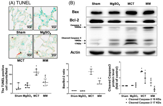 Magnesium sulfate (MgSO4) mitigates monocrotaline-induced apoptosis in the lung tissues. (A) Representative microscopic images of DNA fragmentation in the lung tissues as assayed by the terminal deoxynucleotidyl transferase dUTP nick end labeling (TUNEL) method (200×). The red arrow indicates the representative image of TUNEL-positive nuclei. Mean TUNEL-positive cell counts (per 0.25 mm2) are presented. (B) Representative gel photography of apoptosis-related proteins Bax, Bcl-2, caspase 3, and actin (internal standard) in the lung tissues obtained through immunoblotting assays. Bax/Bcl-2 ratios and relative cleaved caspase 3/actin band densities are presented. Sham: normal saline group. MgOS4: MgSO4 (100 mg/kg/day) group. MCT: monocrotaline (60 mg/kg) group. MM: monocrotaline (60 mg/kg) plus MgSO4 (100 mg/kg/day) group. Data are expressed as median (range). Data of TUNEL and the apoptosis-related protein were obtained from five and three rats from each group, respectively. * p < 0.05 versus the sham group. # p < 0.05 versus the MCT group.
