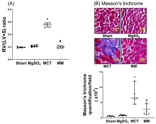 Levels of right ventricular hypertrophy were assayed with respect to the right ventricle to left ventricle plus septum [RV/(LV+S)] ratio and fibrosis levels in the right ventricular myocardium using Masson’s trichrome staining assay. Our data revealed that the RV/(LV+S) ratio and right ventricular fibrosis levels in the sham and MgSO4 group were low, whereas those in the MCT group were significantly higher than those in the sham group (both p < 0.001; Figure 5A,B). In addition, the RV/(LV+S) ratio and right ventricular fibrosis level in the MM group were significantly lower than those in the MCT group (p < 0.001 and p = 0.012, respectively; Figure 5A,B). These findings indicate that long-term MgSO4 therapy decreased monocrotaline-induced right ventricular hypertrophy.