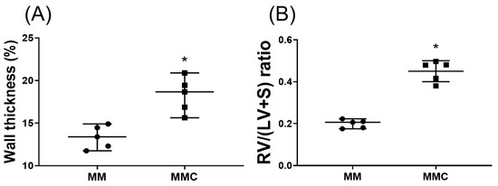 Sternotomy was performed. A 25-gauge needle, connected to a pressure transducer (BIOPAC System, Model MP100, Santa Barbara, CA, USA), was inserted into the right ventricle to measure RVSP, as described in a previous study [45]. After RVSP measurement, the rats were euthanized by decapitation, and the heart was harvested. Atria were removed from the heart and the right ventricle was then dissected from the left ventricle and septum. The samples were weighed and RV/(LV+S) ratios were calculated.