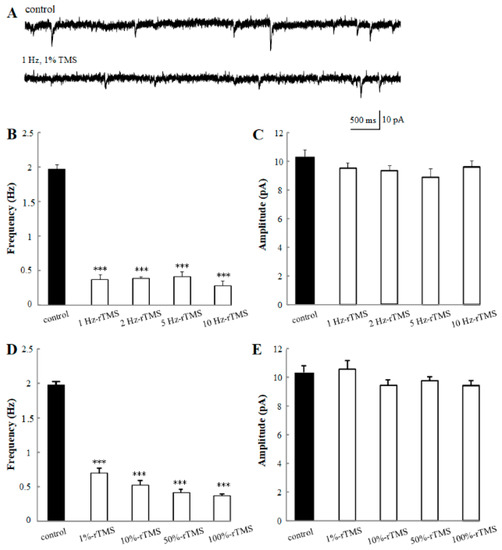 2.1. The Effects of rTMS (at 1 Hz, with 1%, 10%, 50%, and 100% Intensities, and at 1 Hz, 2 Hz, 5 Hz, and 10 Hz, with 1% Intensity) on the mEPSC of PNs