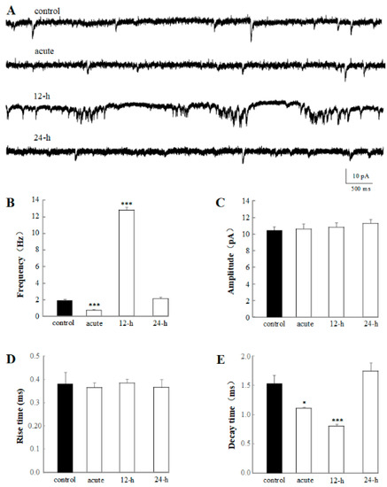 In the present experiment, significant decrease in mEPSC frequency have been detected in the application of varying test rTMS frequencies and intensities, showing the acute effect of rTMS in a frequency- and intensity-dependent manner (Figure 2). To further determine the alteration of rTMS in mEPSC, the chronic effects of 1% rTMS were recorded, and the average frequency, amplitude, rise time, and decay time of mEPSC were analyzed (Figure 3). The representative traces of mEPSC of control, acute, 12-h group, and 24-h group are shown in Figure 3A. The frequencies but not the amplitudes were altered. Compared to the control group (1.91 ± 0.11 Hz), the mEPSC frequency of acute group (0.70 ± 0.073 Hz, p < 0.001) decreased; however, the 12-h group (12.67 ± 0.33 Hz, p < 0.001) increased significantly, showing a burst of mEPSC (Figure 3B). The decay times of mEPSC in acute group (1.12 ± 0.017 ms, p < 0.05) and 24-h group (0.80 ± 0.030 ms, p < 0.001) reduced significantly, compared with the control group (1.52 ± 0.13 ms, Figure 3E). However, no difference was detected in mEPSC amplitude and rise time (Figure 3C,D). According to our data, the average frequency, amplitude, rise time, and decay time of the 24-h group seemed to have no difference with the control group (Figure 3), indicating a regulation of rTMS on the mEPSC of PNs in a time-dependent manner.