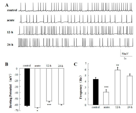 In order to uncover the effects of 1% rTMS at 1 Hz on the excitability of neurons in the neural circuit, the sAPs of the PNs were recorded at the current-clamp voltage. The representative traces of sAP of control, acute, 12-h group, and 24-h group are shown in Figure 4A. The average resting potential (RP) (Figure 4B), frequency (Figure 4C) were analyzed. The average RP and frequency of control group were −62.40 ± 0.81 ms and 4.33 ± 0.30 Hz, respectively. After the application of 1% rTMS at 1 Hz, the average RP of acute group increased to −65.20 ± 1.11 mV (p < 0.05), and the frequency decreased to 2.22 ± 0.41 Hz (p < 0.001). The average RP of 12-h group decreased to −54.40 ± 0.93 mV (p < 0.001), and the frequency increased to 5.94 ± 0.43 Hz (p < 0.01). No significant RP and frequency changes were detected in the 24-h group. This data showed the effects of rTMS on the excitability of the PNs.