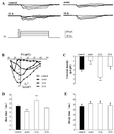 To identify the cellular mechanism of rTMS-induced neural plasticity changes, the calcium channel current was detected. The representative traces of calcium channel of control, acute, 12-h, and 24-h groups are shown in Figure 5A. From the I-V curve in Figure 5B, we can notice that the calcium channel current density can be modulated by rTMS. Our data show that the calcium current density of acute group is inhibited to −0.94 ± 0.31 pA/pF (p < 0.01), and the 12-h group is activated to −4.63 ± 0.60 pA/pF (p < 0.01) compared with the control group (−2.86 ± 0.45 pA/pF), but no significant change has been observed in the 24-h group (Figure 5C). The rise time and decay time were analyzed. Compared to the control group (11.01 ± 0.69 ms), the rise time of acute and 12-h groups changed to 8.62 ± 0.18 ms (p < 0.01) and 13.58 ± 0.72 ms (p < 0.01), respectively, but the 24-h group has not changed (Figure 5D). There is no difference in the decay time among these four groups (Figure 5E). In conclusion, the regulation of rTMS on the electrophysiological properties of PNs, including the neural plasticity and excitability of PNs, have shown to be associated with calcium channel activities in a time-dependent manner.