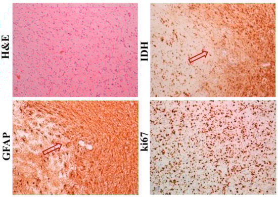 Immunohistochemical analysis of the glioblastoma (GBM) sample (sample No. 1). GBM samples were processed and GFAP, IDH, ki-67, and haematoxylin and eosin were detected by immunohistochemistry and histochemistry, as described in the Materials and Methods section. Bright-field microscopy, 100×, scale. Arrows show the GBM margin.