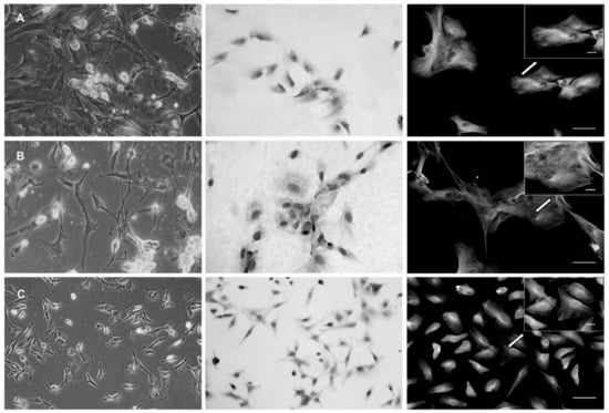 Phase contrast (left), haematoxylin and eosin (middle), and fluorescence (microtubules) (right) of primary glioblastoma cells (GBM1) isolated using enzymatic method (A) and mechanic method (B). Stabilized glioblastoma cell line A-172 (C) was used for comparison. Magnification 200 ×, scale 30 µm, inset images—magnification 400×, scale 5 µm.