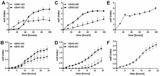 Proliferation (A,C,E) and migration potential (B,D,F) of primary glioblastoma cells (GBM) cells obtained from five patient samples (GBM1, GBM2, GBM32, GBM33, GBM34) with enzymatic method (ED) or mechanic method (MD) and stabilized A-172 cell line. Proliferation assay (recorded every h for 99 h) and migration assay (recorded every 10 min for 24 h) were performed using xCELLigence Real-Time Cell Analyzer as described in the Materials and Methods section. Each measurement was performed in three independent experiments. * p < 0.05 ED vs. MD; data are expressed as average ± SD.