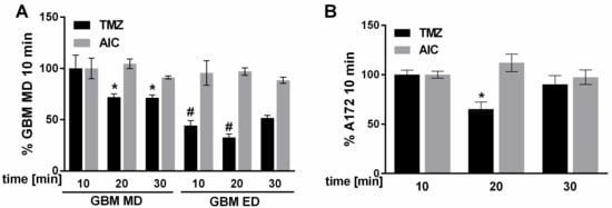 MS analysis of parent drug TMZ and its 5-aminoimidazole-4-carboxamide (AIC) metabolite in primary glioblastoma cells, isolated using enzymatic method (ED) and mechanic method (MD) from the GBM (A) and in stabilized cell line A-172 (B), used for comparison. The data are expressed as percentage of TMZ or AIC inside the GBM-MD, GBM-ED, and A-172 cells per mg of protein and amount was determined by LC-MS analysis after 10, 20, and 30 min treatment. Measurements were performed in two independent experiments. * p < 0.05 20 and 30 min intervals vs 10 min interval; # p < 0.05 ED vs. MD.
