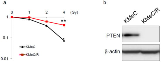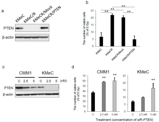 2.2. Overexpression of PTEN Canceled the Radioresistance of KMeC/R Cells and Silencing of PTEN Enhanced that of KMeC Cells