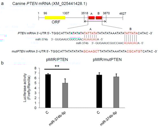 2.5. miR-374b-5p Directly Targeted PTEN