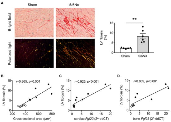 The 5/6 nephrectomized (5/6Nx) rats develop left ventricular (LV) fibrosis, which correlates with fibroblast growth factor 23 (Fgf23) expression. (A) Representative bright field and polarized light microscopy images of picrosirius red-stained myocardial tissue of 5/6Nx and sham-operated rats and quantification of interstitial collagen fiber deposition demonstrating increased LV fibrosis in 5/6Nx rats (scale bar, 50 µm). (B–D) Pearson’s correlations of LV fibrosis with cross-sectional area of cardiomyocytes, and cardiac and bone Fgf23 mRNA expression as determined by quantitative real-time PCR using Gapdh as housekeeping gene. Clear dots, sham-operated rats; black dots, 5/6Nx rats. All values are shown as mean ± SEM; ** p < 0.01; n = 5–6 rats per group.