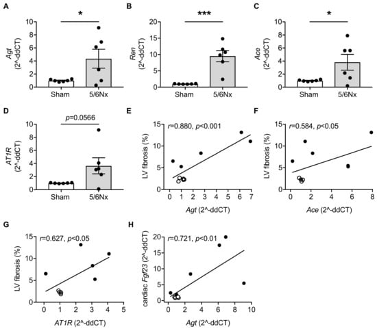 Here, 5/6 nephrectomy (5/6Nx) in rats induces cardiac expression of renin-angiotensin-aldosterone system (RAAS)-associated genes that correlates with left ventricular (LV) fibrosis. (A–C) Quantitative real-time PCR analyses in 5/6Nx rats show cardiac-specific induction of angiotensinogen (Agt), renin (Ren) and angiotensin converting enzyme (Ace), while (D) cardiac angiotensin II receptor type 1 (AT1R) mRNA expression is not significantly induced. (E–G) Pearson’s correlations of LV fibrosis with cardiac expression of Agt, Ace and AT1R, and (H) of cardiac Fgf23 with Agt mRNA expression. Clear dots, sham-operated rats; black dots, 5/6Nx rats. All values are shown as mean ± SEM; * p < 0.05, *** p < 0.001; n = 5–6 rats per group.