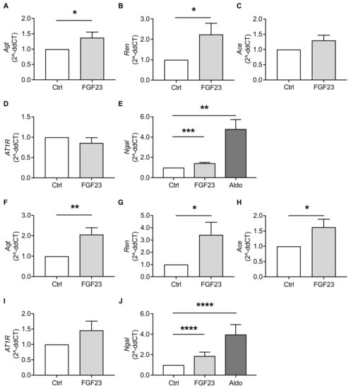 In NRCF, Agt, Ren and Ace were markedly induced by FGF23 (Figure 3F–H). A potential influence of FGF23 on AT1R mRNA expression was not statistically significant (p = 0.1801; Figure 3I). Nevertheless, consistent with FGF23-mediated effects observed in NRVM, Ngal expression in NRCF was stimulated by FGF23 and aldosterone (Figure 3J). In summary, these data affirmed our recent findings on FGF23-enhanced cardiac expression of Agt [] and suggest that FGF23 further stimulates RAAS by induction of Ren and Ace in cardiomyocytes and cardiac fibroblasts in vitro. Moreover, the elevation of Ngal mRNA levels points towards an increased aldosterone activity because of FGF23 treatment in both cardiac cell types.
